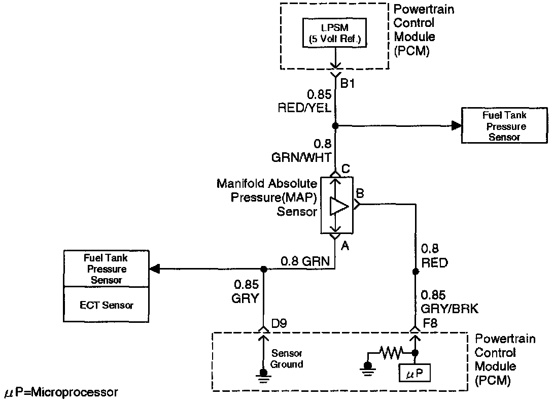 The manifold absolute pressure (MAP) sensor measures the changes in the intake MAP which result from engine load (intake manifold vacuum) and engine speed changes; and converts these into a voltage output. The powertrain control module (PCM) sends a 5-volt reference voltage to the MAP sensor. As the MAP changes, the output voltage of the sensor also changes. By monitoring the the sensor output voltage, the PCM knows the MAR A lower pressure (low voltage) output voltage will be about 1-2 volts at idle. Higher pressure (high voltage) output voltage will be about 4-4.8 volts at wide open throttle. The MAP sensor is also used, under certain conditions, to measure barometric pressure, allowing the PCM to make adjustments for different altitudes. The PCM uses the MAP sensor to diagnose proper operation of the EGR system, in addition to other functions.