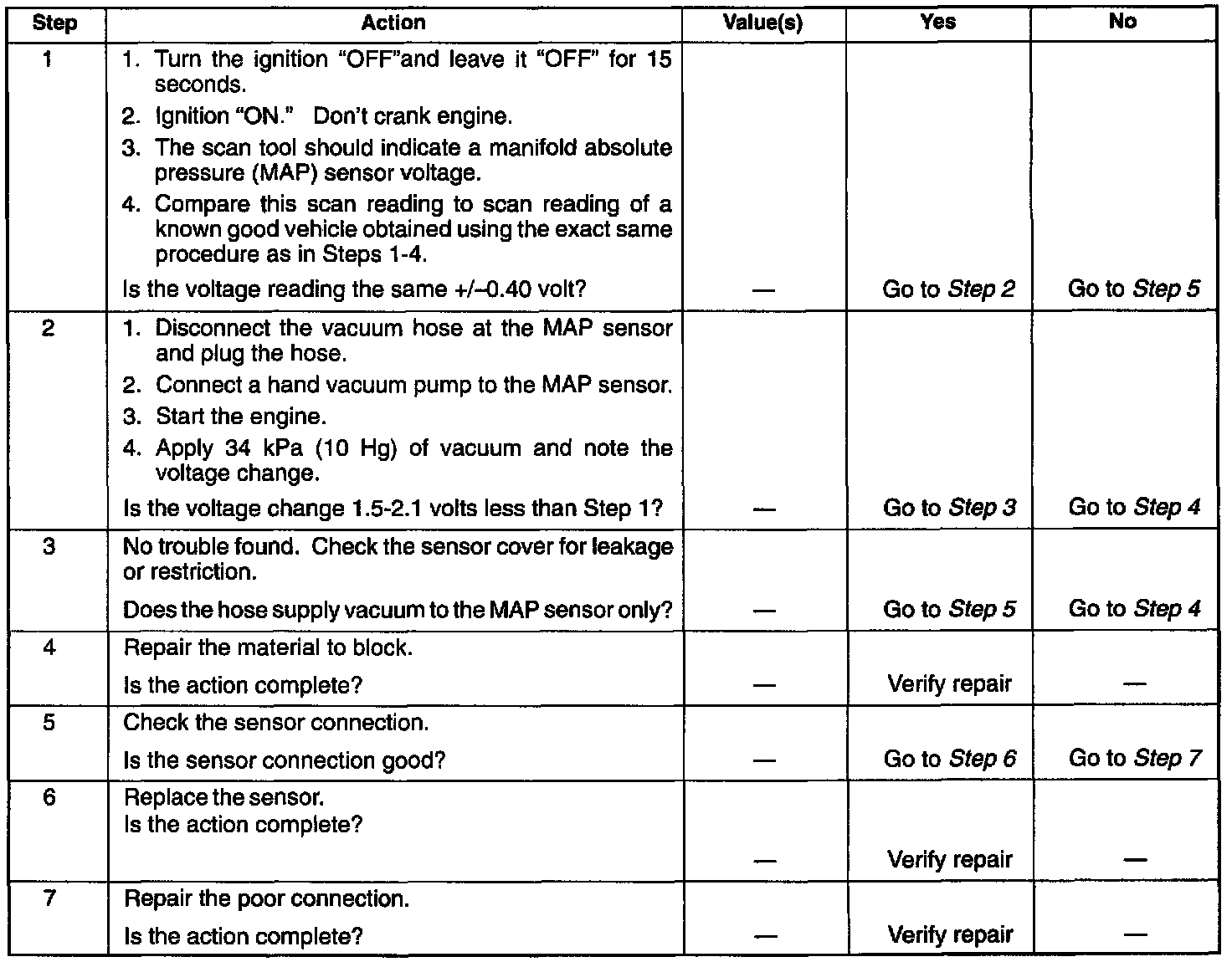 2. Applying 34 kPa (10 Hg) vacuum to the MAP sensor should cause the voltage to be 1.5-2.1 volts less than the voltage at step 1. Upon applying vacuum to the sensor, the change in voltage should be instantaneous. A slow voltage change indicates a faulty sensor.