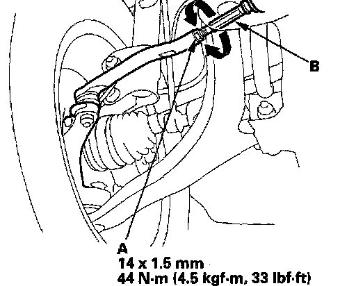 3. Hold the adjusting bolt (A) on the rear lower arm B, and loosen the self-locking nut (B).