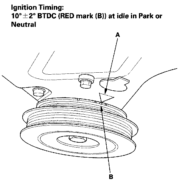 5. Point the light toward the pointer (A) on the timing belt cover. Check the ignition timing under no load conditions: headlights, blower fan, rear window defogger, and air conditioner are not operating. If the ignition timing differs from the specification below, replace the PCM.