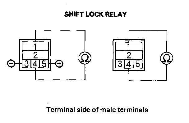 14. Check for continuity between the No. 1 terminal of the shift lock relay socket and the No. 2 terminal of the shift lock solenoid connector.