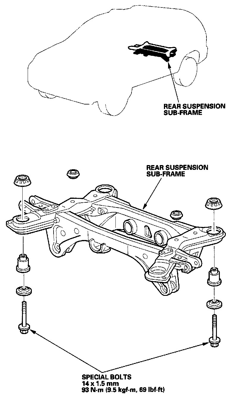 After removing the sub-frame mounting bolts, be sure to replace them with new ones.