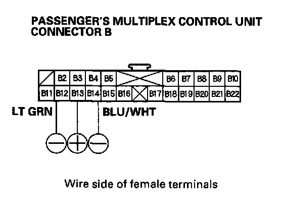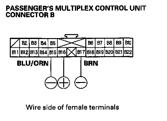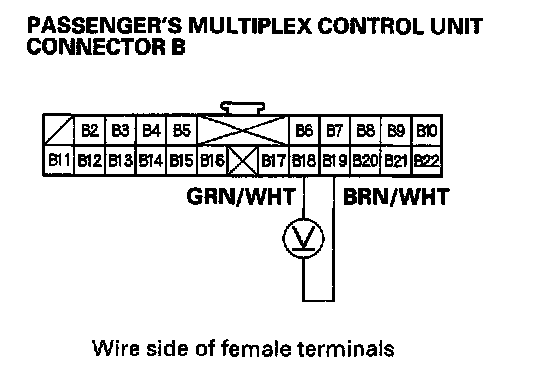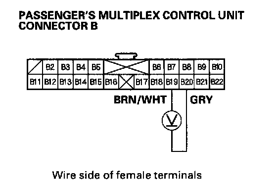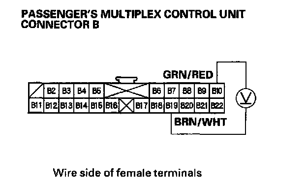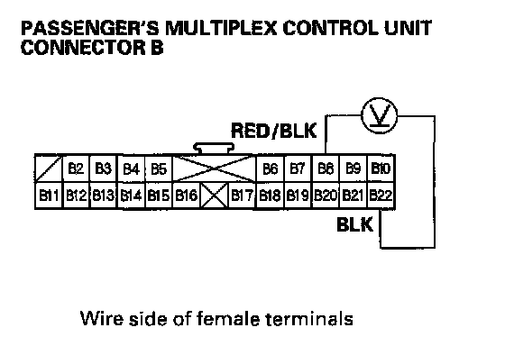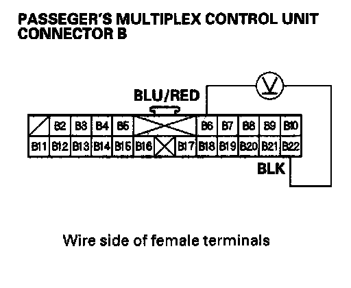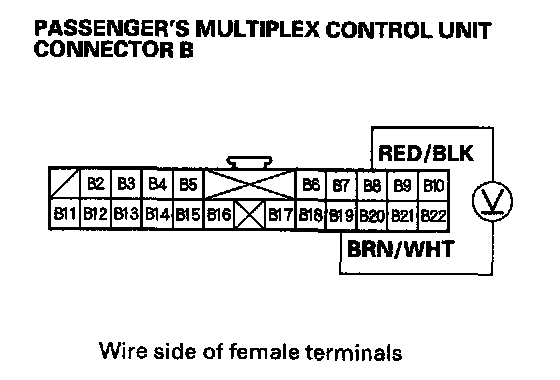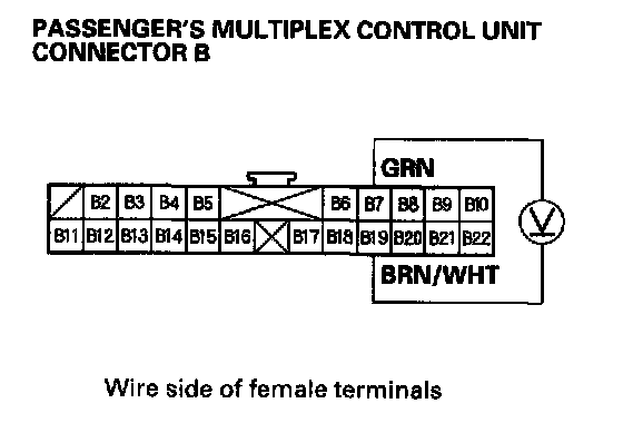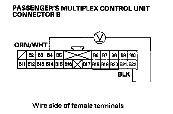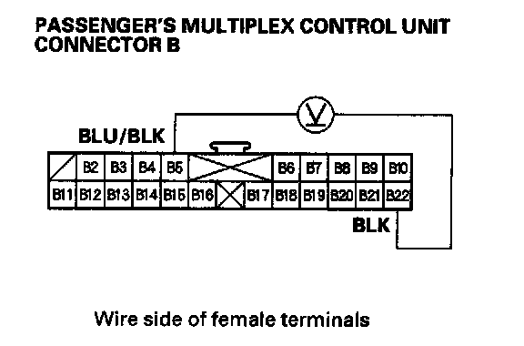 2. Check for voltage between the B2 and B22 terminals of the passenger's multiplex control unit with the power mirror switch pressed UP or Left.