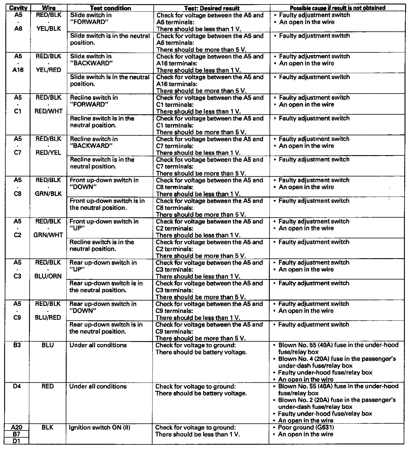 5. With the power seat control unit still disconnected, make these input tests at the connectors.