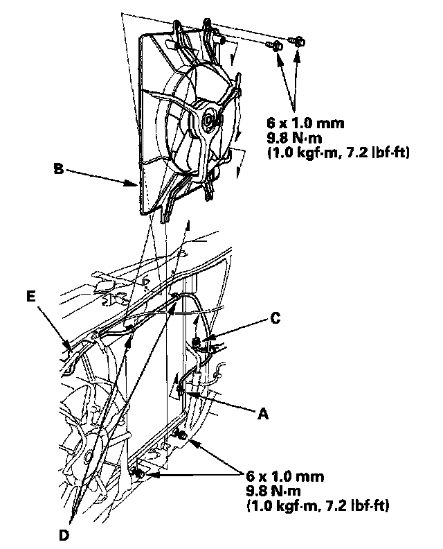 6. Remove the compressor clutch connector (A) from the condenser fan shroud (B), then disconnect the connector. Disconnect the condenser fan connector (C), then remove the wire harness clips (D) from the condenser fan shroud. Remove the cruise control actuator cable (E) from the clamp. Loosen the lower mounting bolts, then remove the upper mounting bolts and the condenser fan shroud. Be careful not to damage the radiator fins when removing the condenser fan shroud.