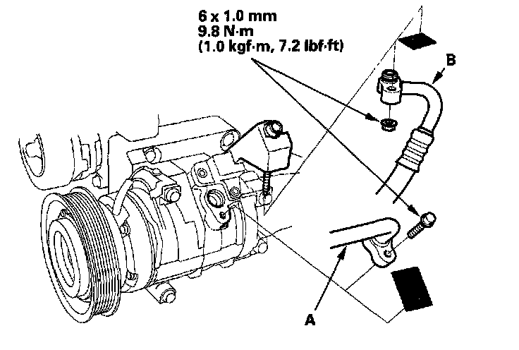 7. Remove the bolt and the nut, then disconnect the suction line (A) and discharge line (B) from the compressor. Plug or cap the lines immediately after disconnecting them to avoid moisture and dust contamination.
