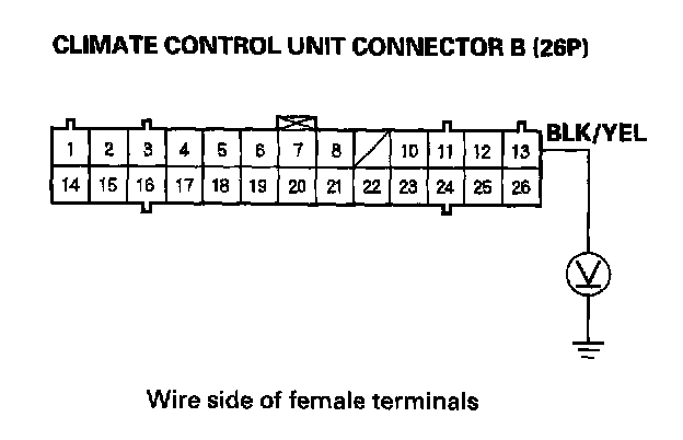 4. Measure the voltage between the No.13 terminal of climate control unit connector B (26P) and body ground.