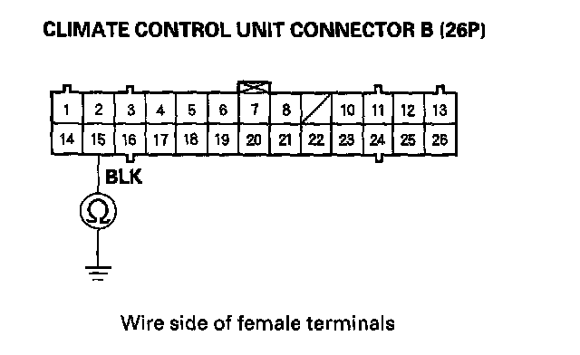 6. Check for continuity between the No.15 terminal of climate control unit connector B (26P) and body ground.