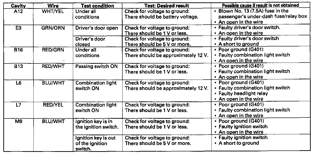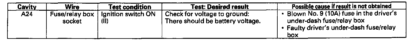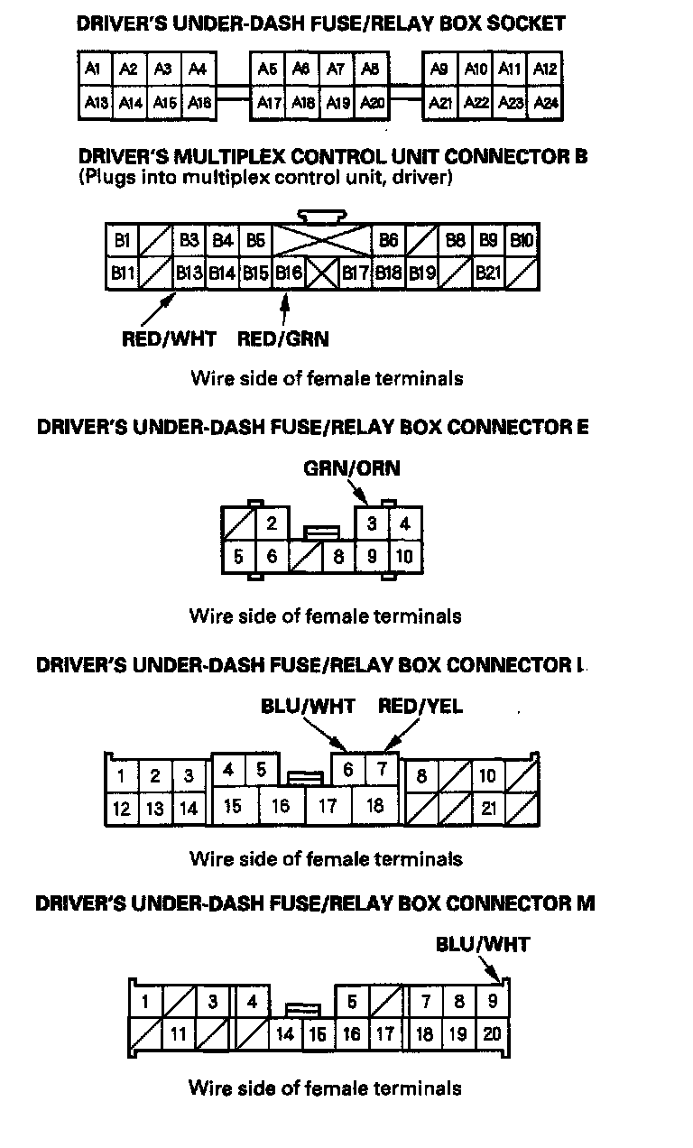 5. Reconnect the driver's multiplex control unit to the driver's under-dash fuse/relay box, and perform the following input tests at the appropriate connectors on the driver's under-dash fuse/relay box. For driver's under-dash fuse/relay box connector socket location.