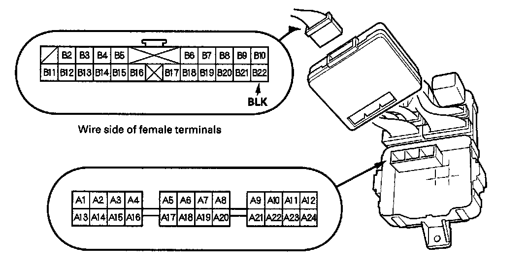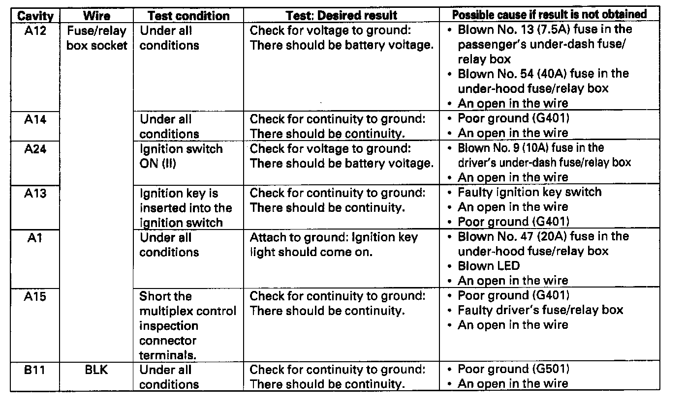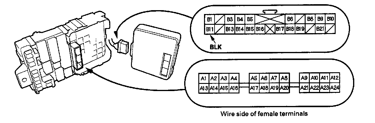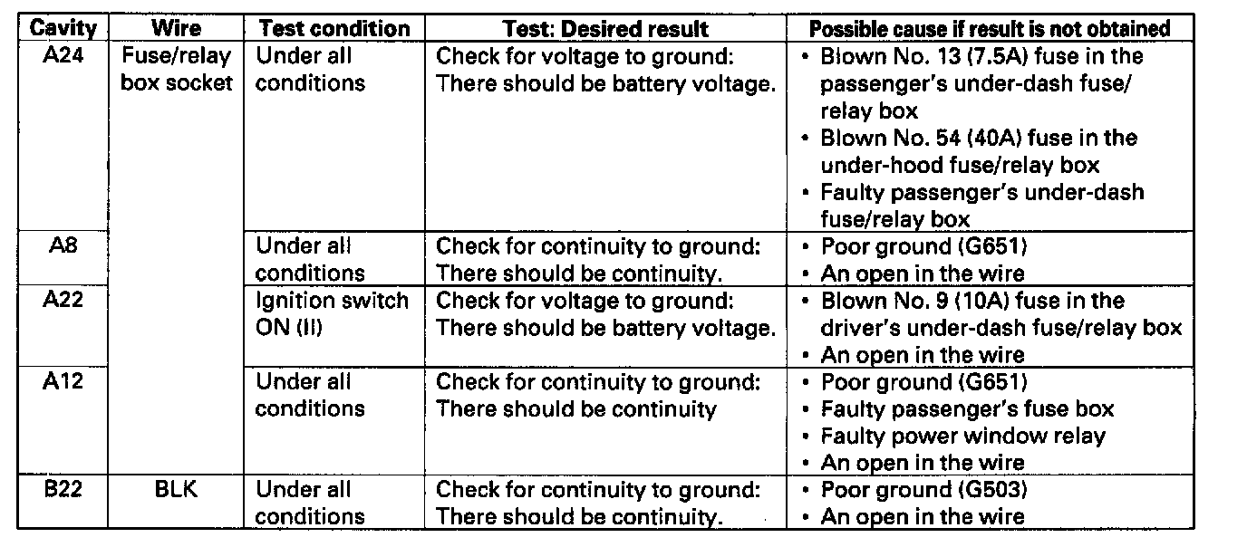 10. Make the following input tests at 22P connector B and the driver's under-dash fuse/relay box socket.