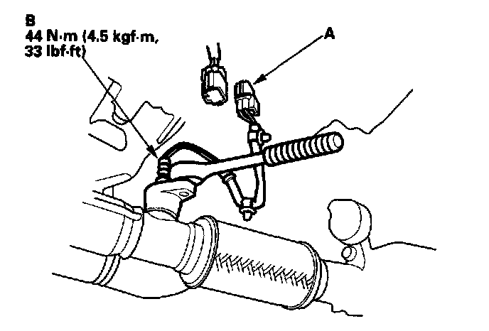 1. Disconnect the primary HO2S 4P connector (A), then remove the primary HO2S (B).