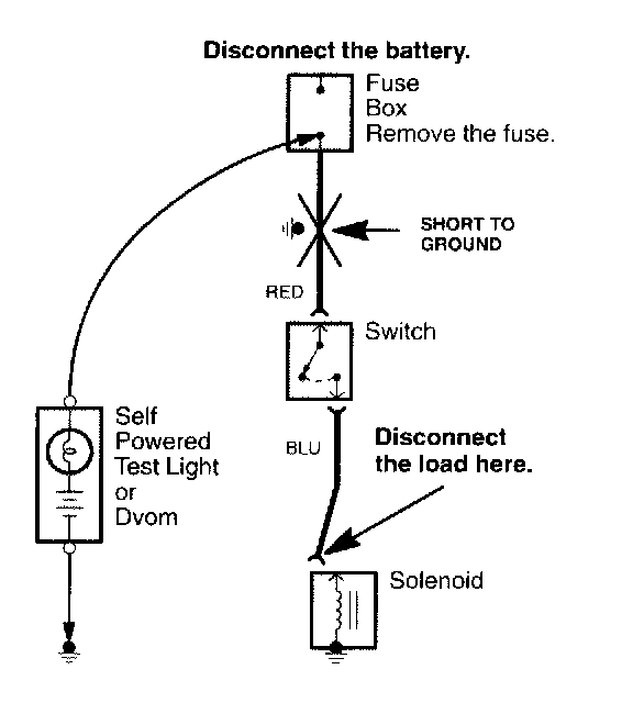 Testing for a Short with a Self-Powered Test Light or DVOM1. Remove the blown fuse and disconnect the battery and load.
