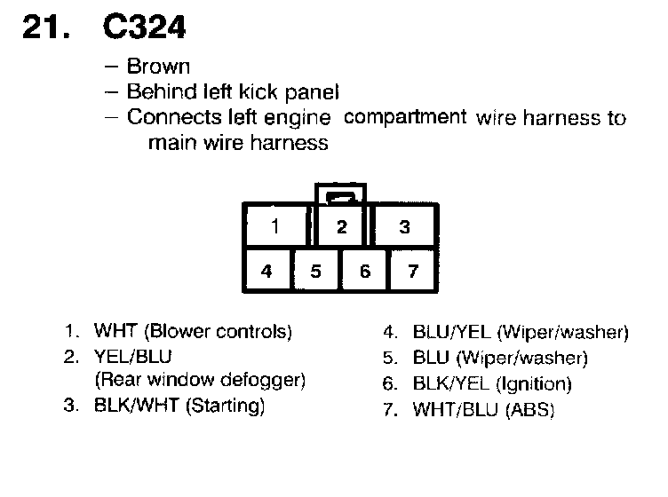 Example: The blower, rear window defogger, and the windshield wiper don't work List all in-line and fuse box connectors in the blower controls circuit and then check the Connector Terminal View section (see sample). You find that C324 is common to the blower controls, rear window defogger, and wiper/washer, so you inspect C324 and find the problem: bent terminals.