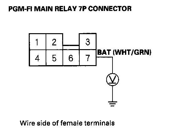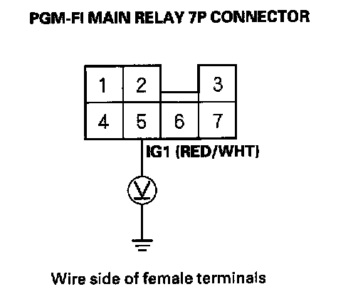 6. Turn the ignition switch ON (II), and measure voltage between body ground and PGM-FI main relay 7P connector terminal No.5.