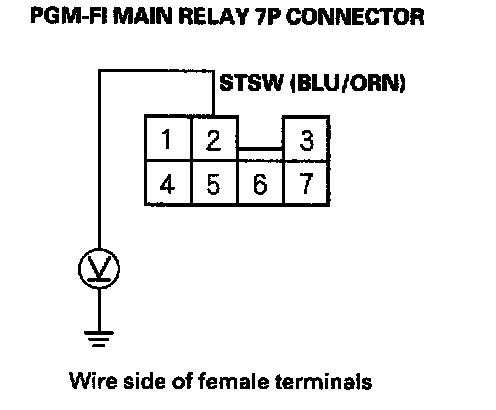8. Shift to Park, then turn the ignition switch to the START (III) position, and measure voltage between body ground and PGM-FI main relay 7P connector terminal No.2.