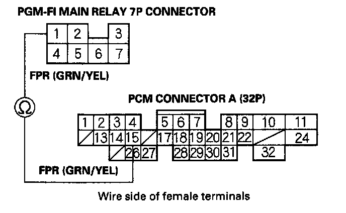 3. Check for continuity between body ground and PGM-FI main relay 7P connector terminal No.3.