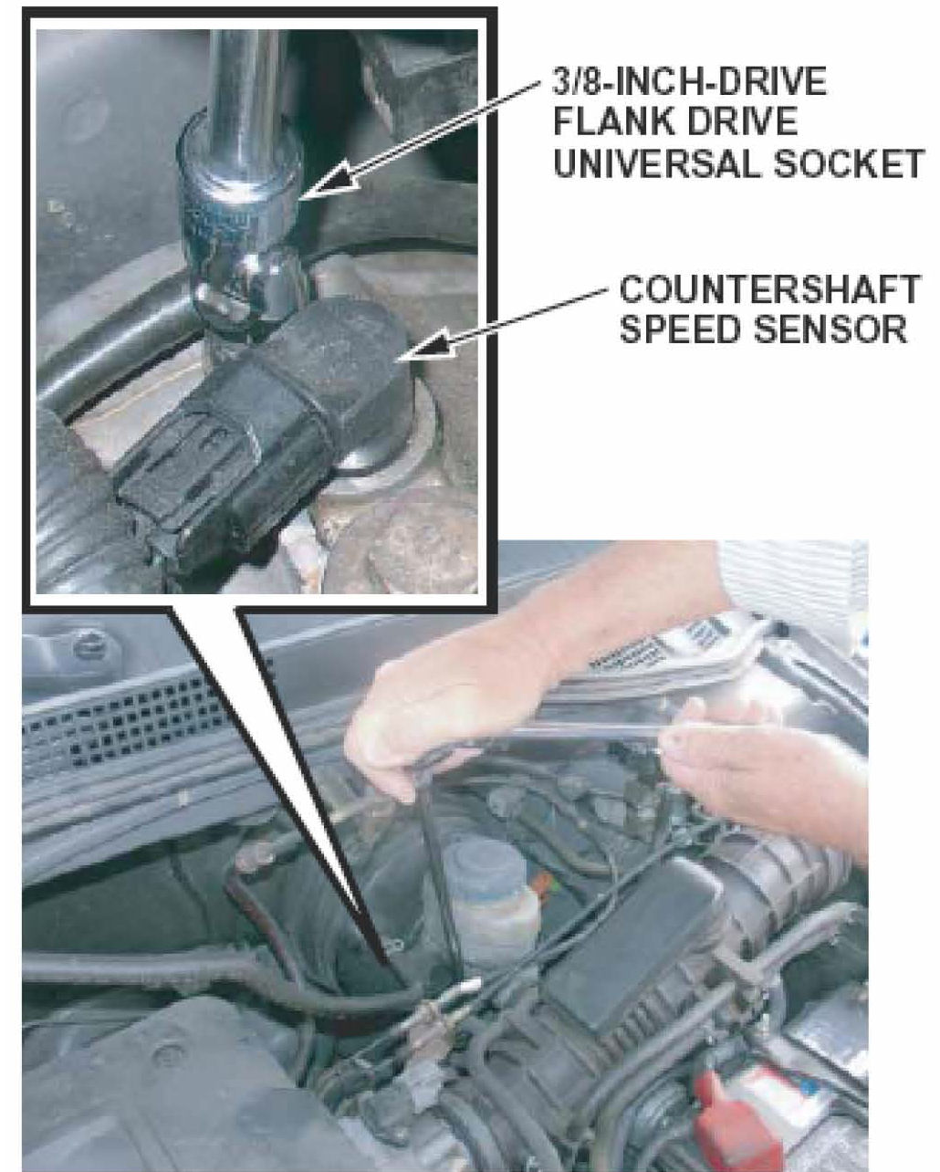 Fortunately, we've found a solution for this problem. The Snap-on folks make a nifty 3/8-inch-drive flank drive(R) universal socket. We tested this socket and had no trouble safely removing the countershaft speed sensor. Its swivel base lets you angle the extension away