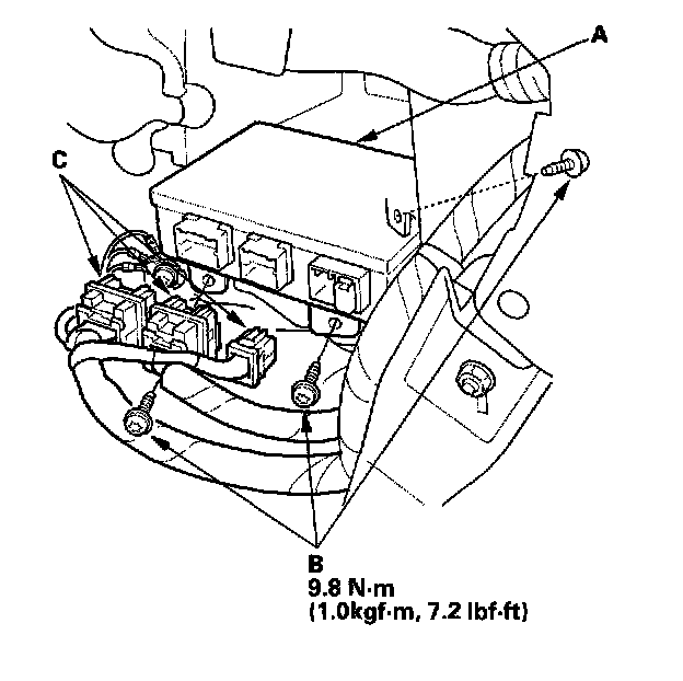 1. Install the new SRS unit (A) with Torx bolts (B), then connect the connectors (C) to the SRS unit; push it into position until it clicks.