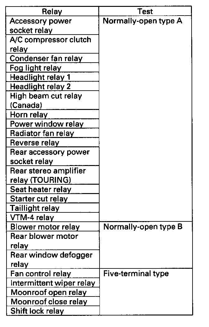 Power Relay TestUse the chart to identify the type of relay, then do the test listed for it.