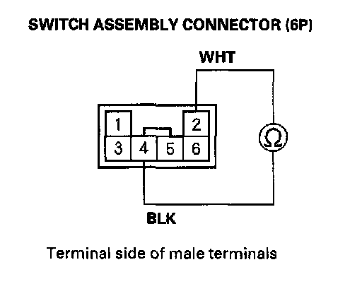 8. Check for continuity between the No. 4 terminal of the switch assembly connector (6P) and the No. 5 terminal of the key switch connector.