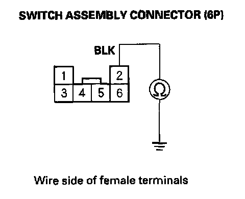 9. Check for continuity between the No. 2 terminal of the switch assembly connector (6P) and body ground.