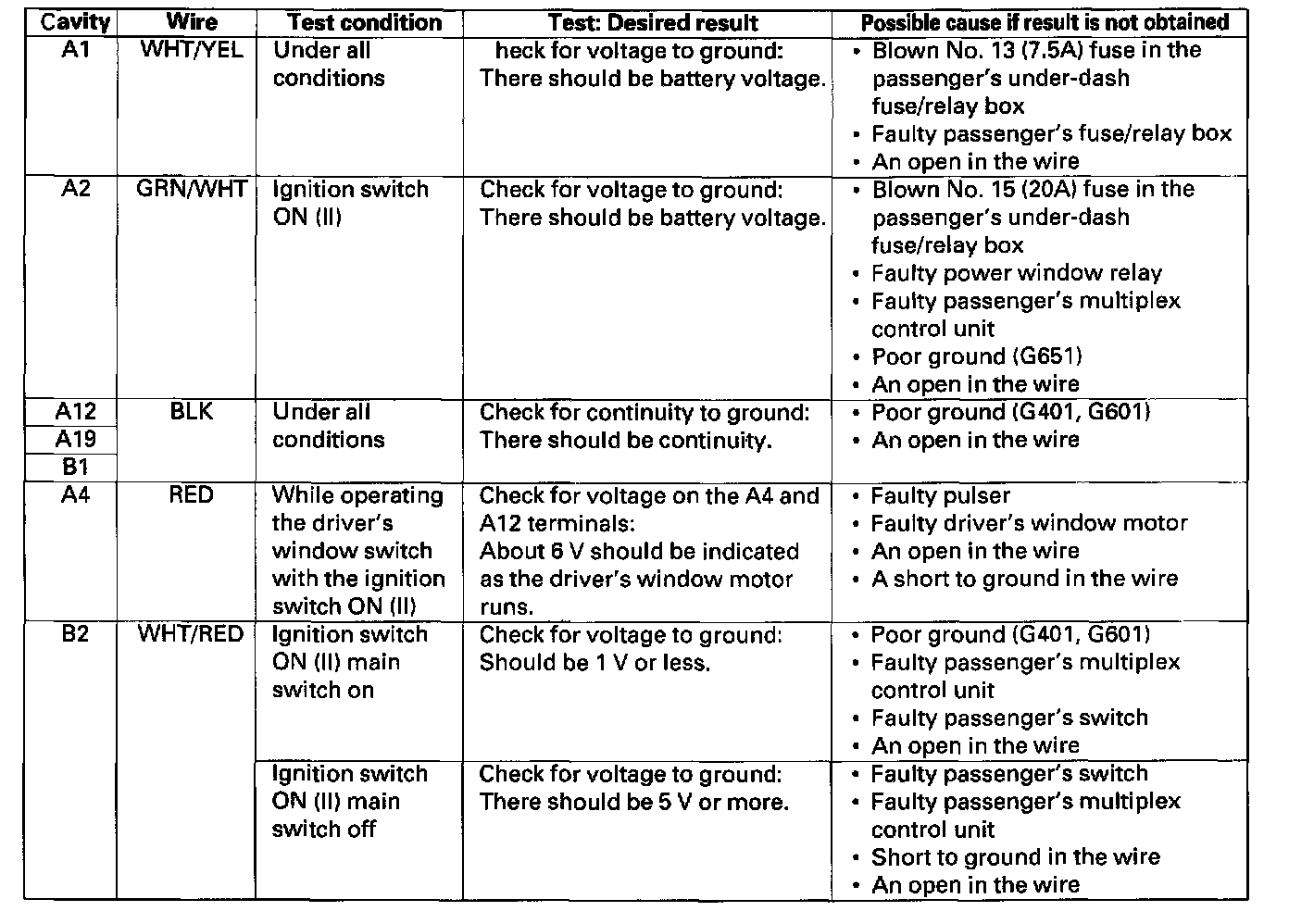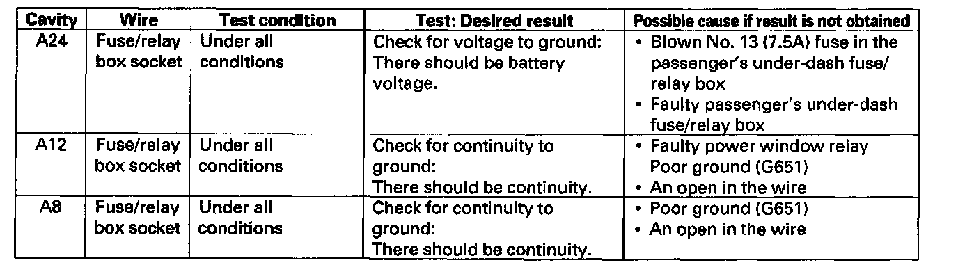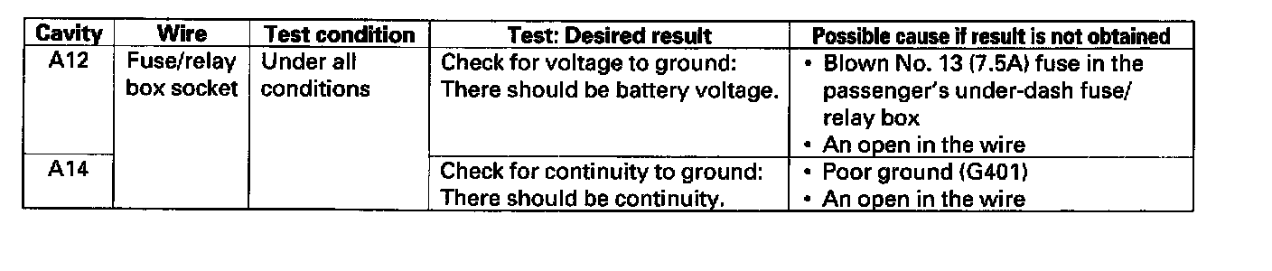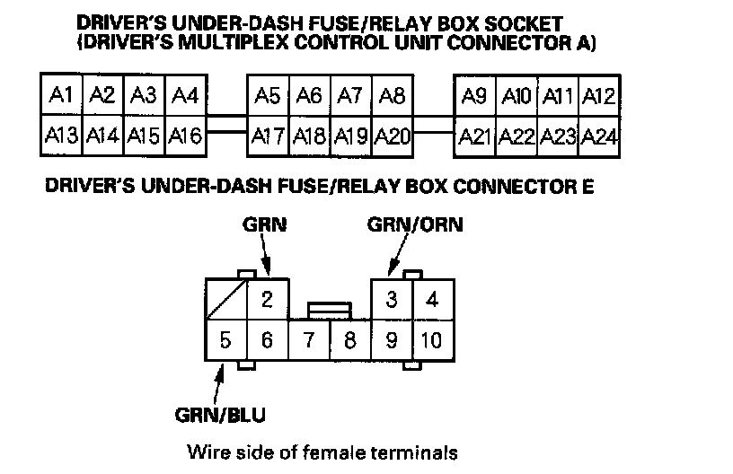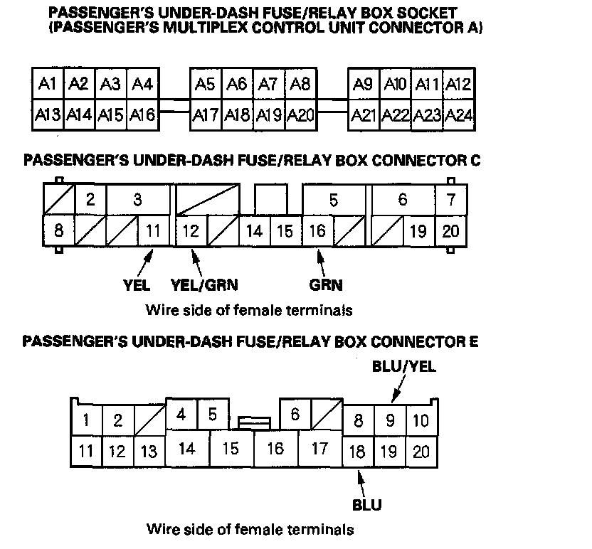 8. With the passenger's multiplex control unit still disconnected, make these input tests at the passenger's under-dash fuse/relay box socket.