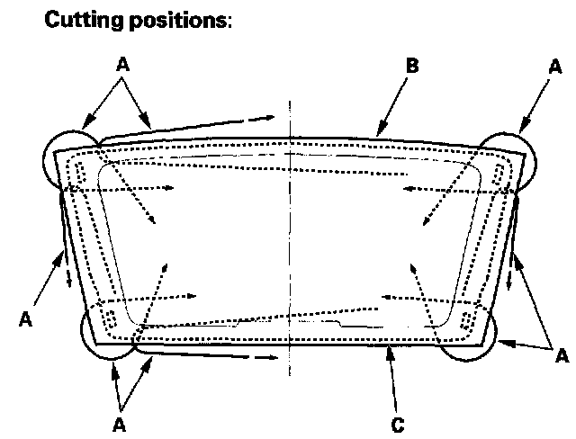 5. With a helper on the outside, pull the piano wire (A) back and forth in a sawing motion. Hold the piano wire as close to the rear window (B) as possible to prevent damage to the tailgate, and carefully cut through the adhesive (C) around the entire rear window.