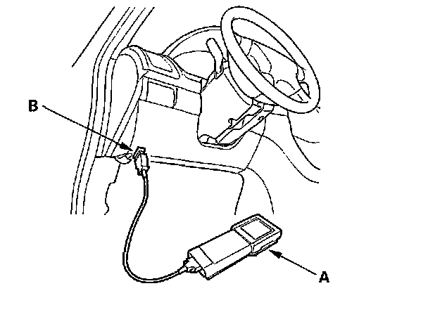 VSA Pressure Sensor Neutral Position Memorization1. With the ignition switch OFF, connect the Honda PGM Tester (A) or HDS to the 16P Data Link Connector (DLC) (B) under the driver's side of the dashboard.