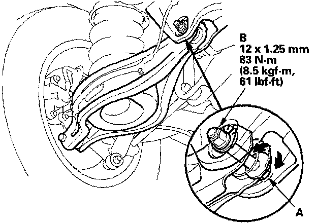 3. Hold the adjusting bolt (A) on the rear lower arm B. and loosen the self-locking nut (B).