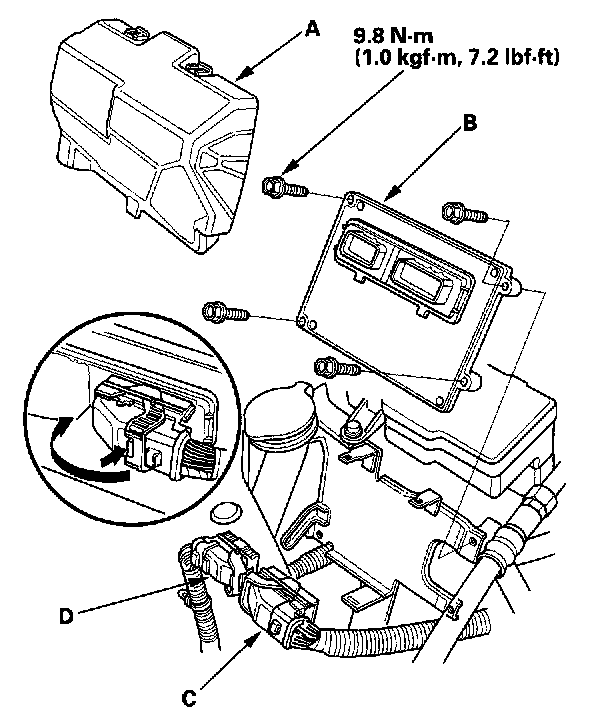 5. Disconnect the PCM connectors A (73P) (C) and B (56P) (D).