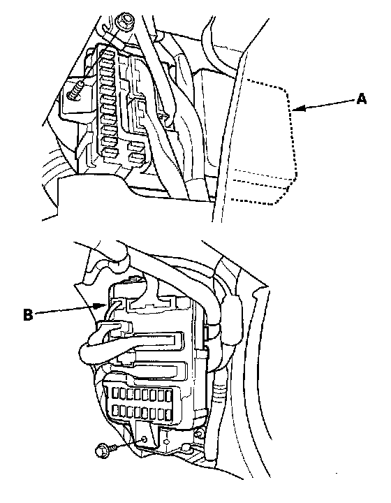 4. Remove the mounting bolt, and pull the driver's under-dash fuse/relay box (A) or passenger's under-dash fuse/relay box (B) away from the body.