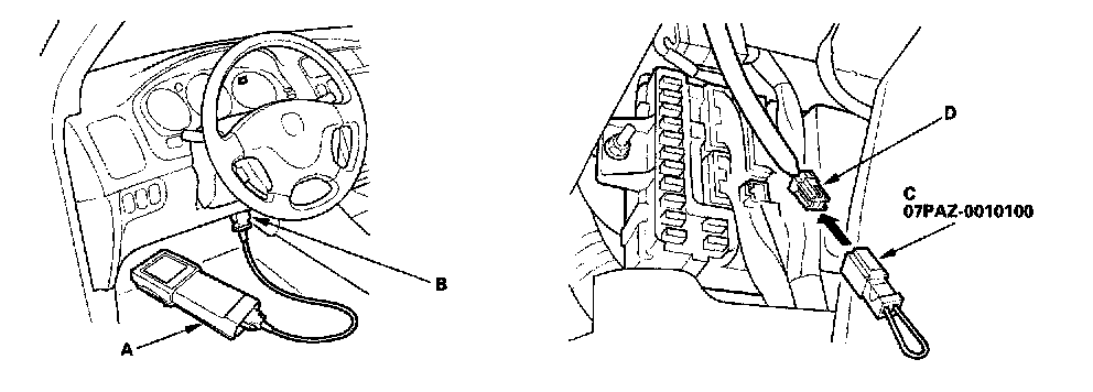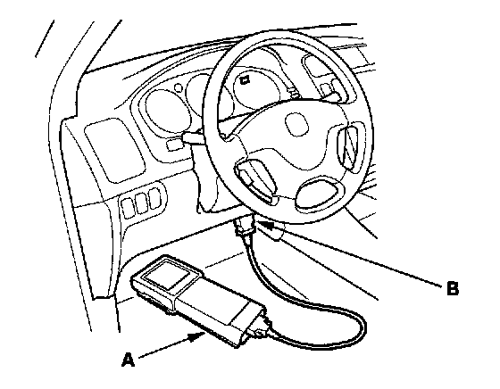 3. Connect the Honda PGM Tester (A) or HDS to the DLC (B).