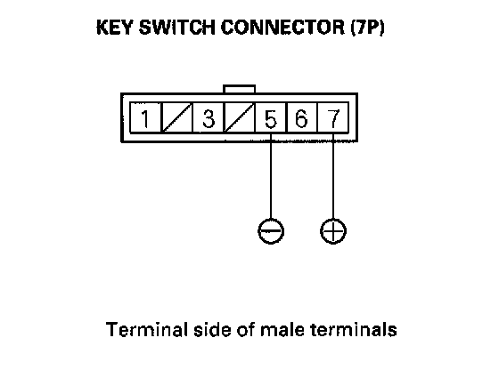 2. Connect the No. 7 terminal of the key switch connector to the battery positive terminal, and connect the No. 5 terminal to the battery negative terminal.