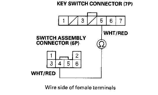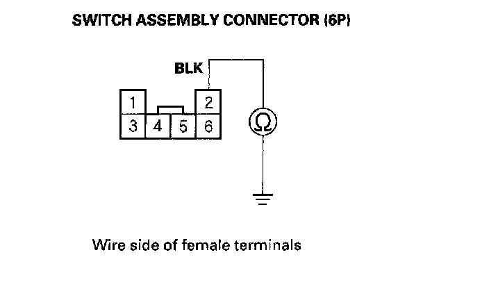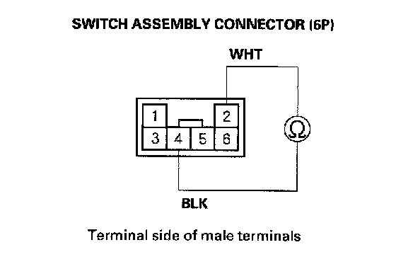 8. Check for continuity between the No. 4 terminal of the switch assembly connector (6P) and the No. 5 terminal of the key switch connector.