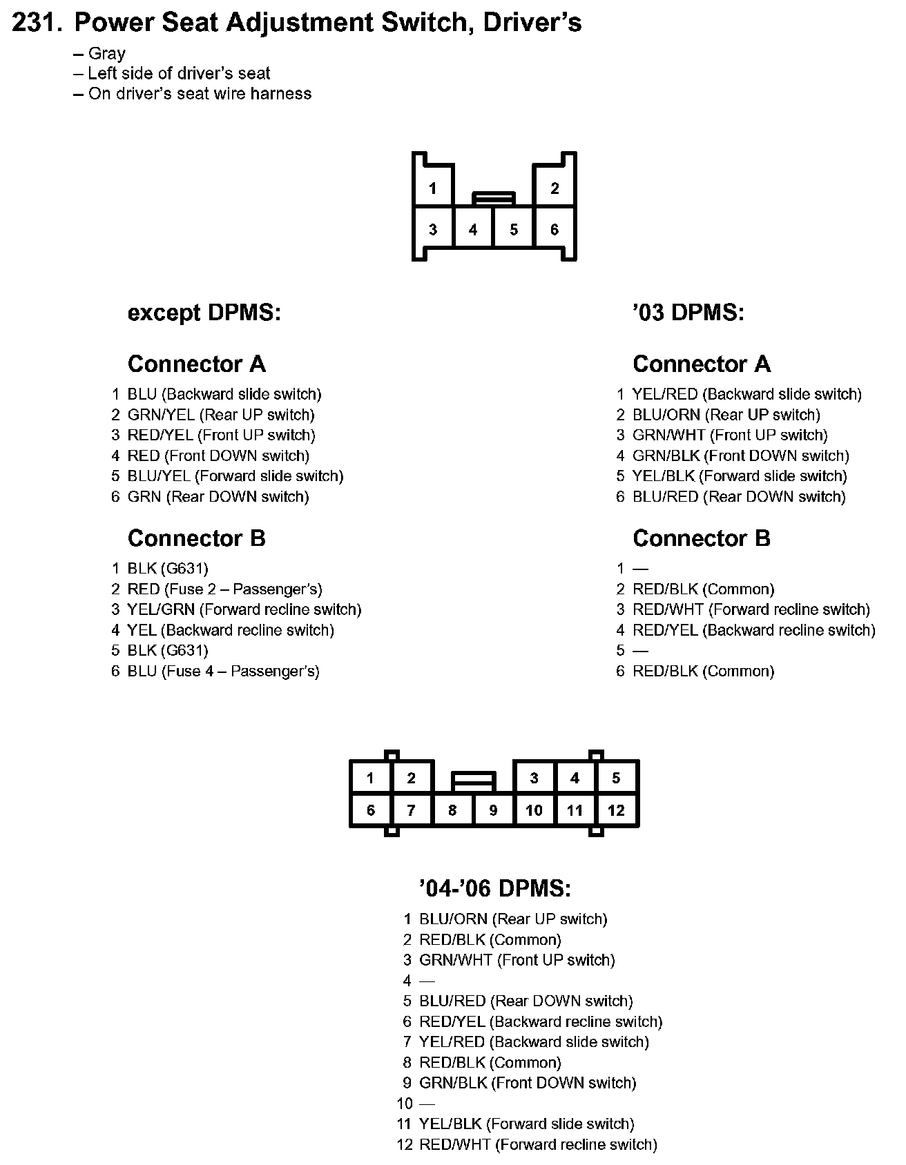 231. Power Seat Adjustment Switch, Driver's:
