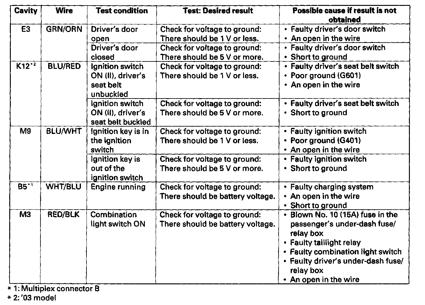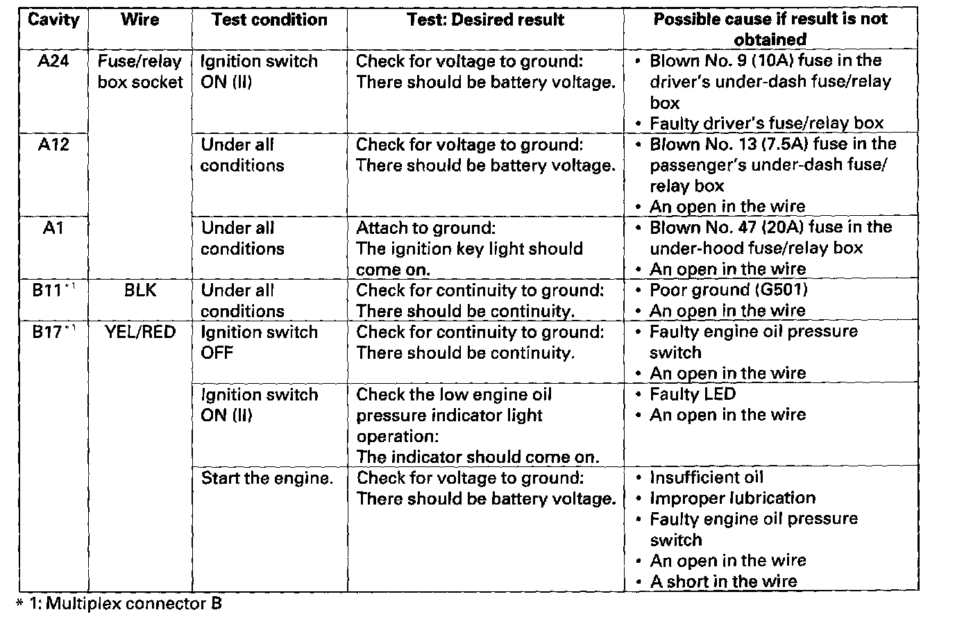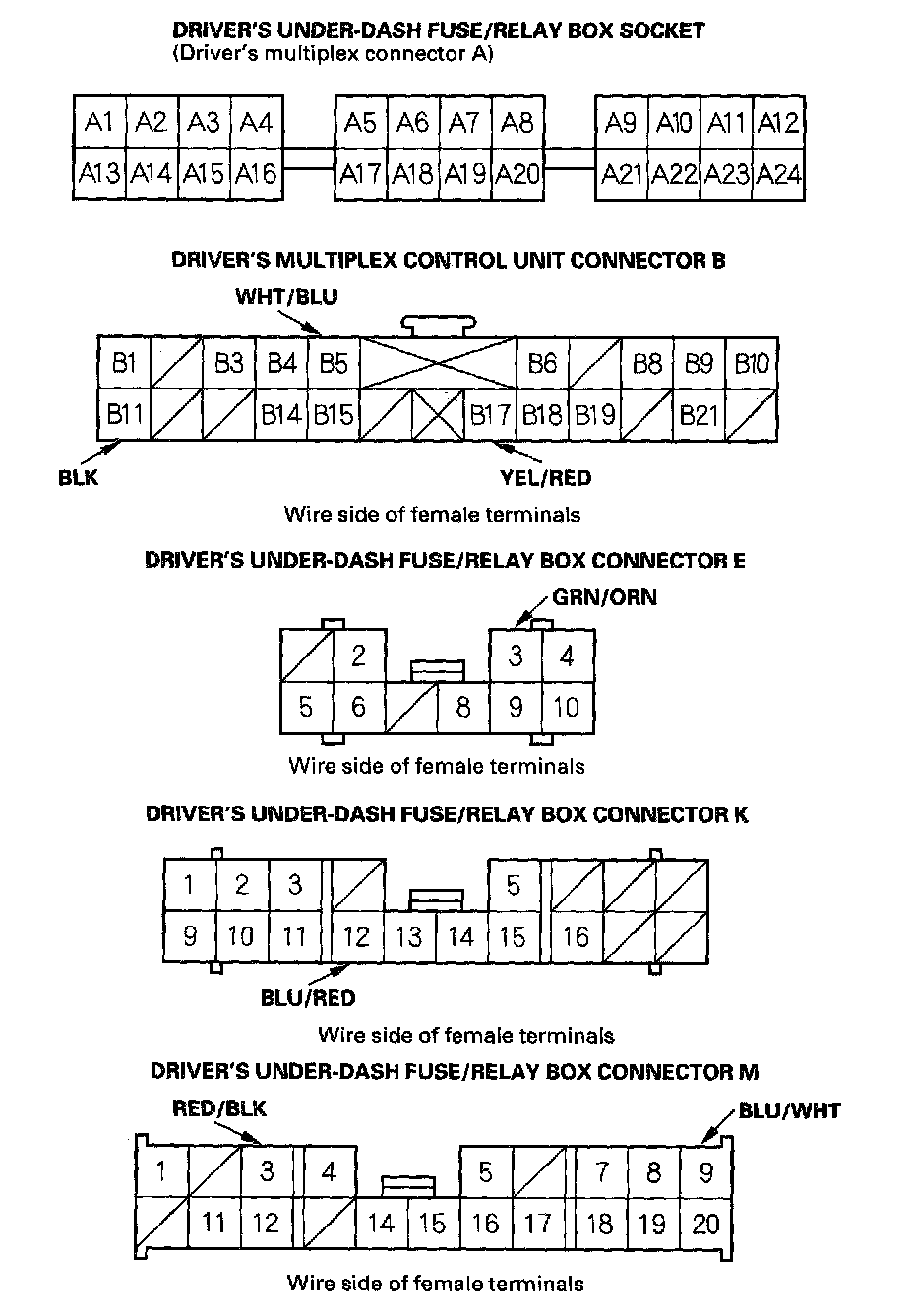 4. With the driver's multiplex control unit still disconnected, make these input tests at the connector and driver's under-dash fuse/relay box sockets.