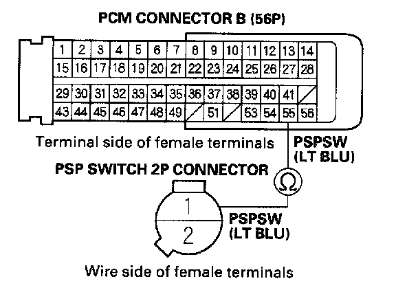 18. Check for continuity between PCM connector terminal B55 and PSP switch 2P connector terminal No.1.
