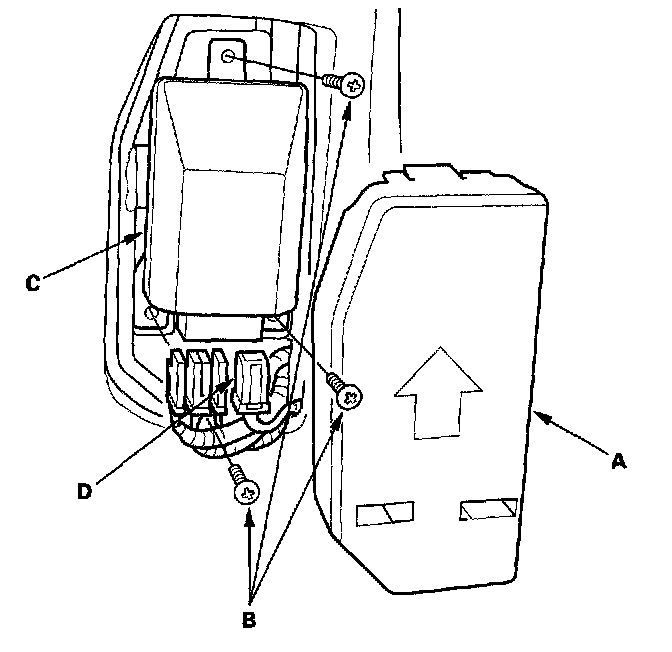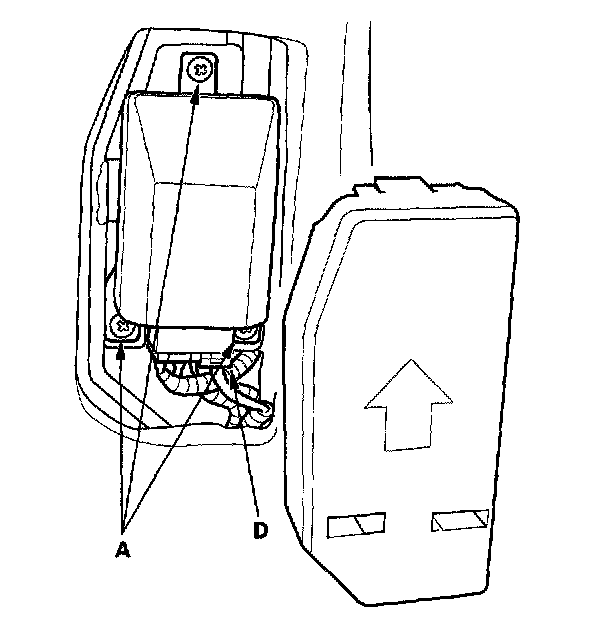 1. Place the new OPDS unit on the front passenger's seat-back frame. Tighten the three screws (A), and connect the OPDS unit harness 8P connector D and sensor connectors to the OPDS unit. Reinstall the cover.