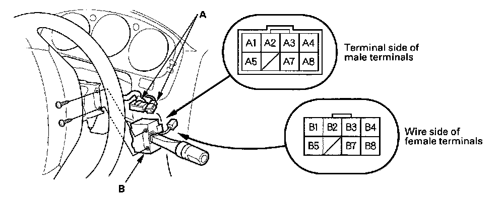 3. Disconnect the 8P connectors (A) from the wiper/washer switch (B), then remove the two screws and the switch.