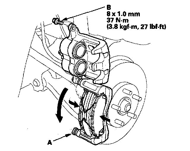 3. Remove the flange bolt (B) while holding the caliper pin A with a wrench being careful not to damage the pin boot, and pivot the caliper (C) up out of the way. Check the hose and-pin boots for damage and deterioration.