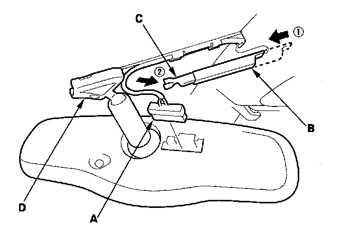 2. Slide the mirror harness upper cover (B) forward, then remove the mirror harness cover (C) from the mirror base (D).