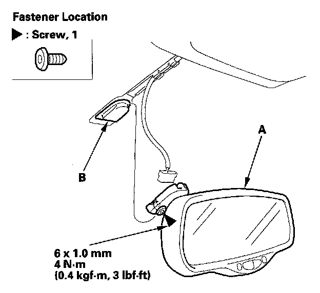 3. Using a T20 TORX bit, loosen the screw, then slide the rearview mirror (A) rearward and off the mount (B).