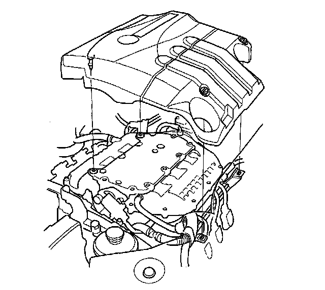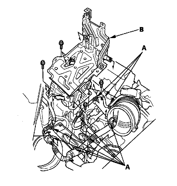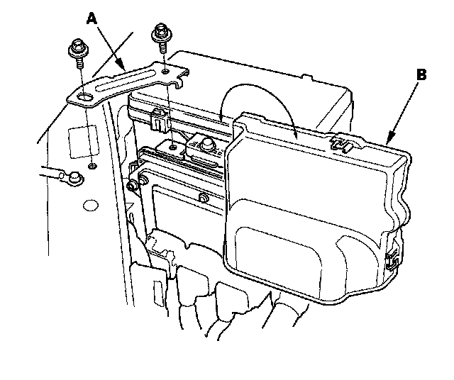 23. Remove the bracket (A), then remove the powertrain control module (PCM) cover (B).