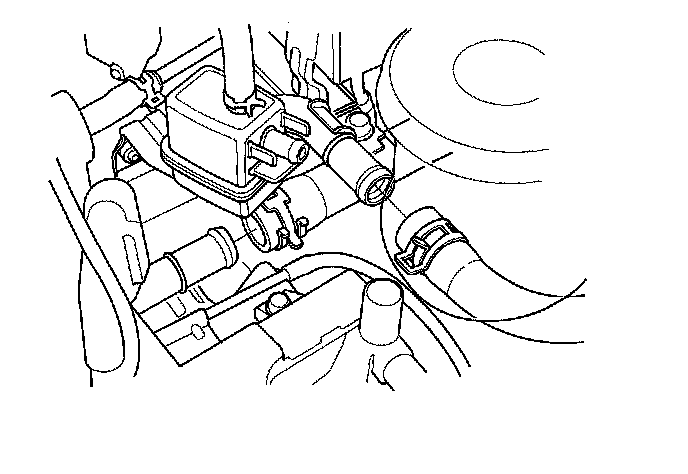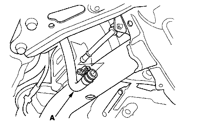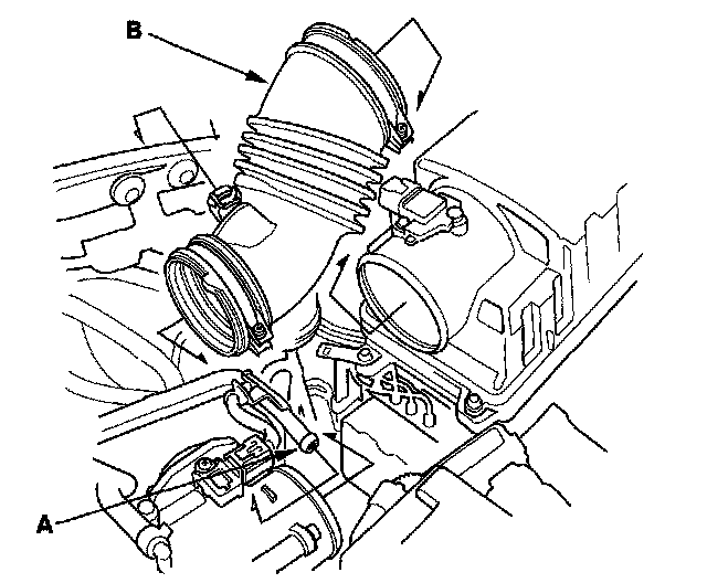 16. Remove the brake booster vacuum hose (A), and evaporative emission (EVAP) canister hose (B).