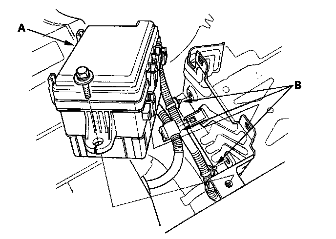 11. Remove the main under-hood fuse box (A), then remove the harness clamps (B).