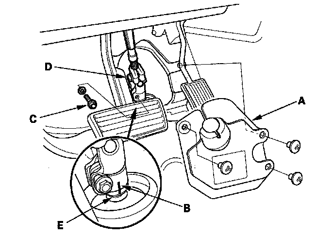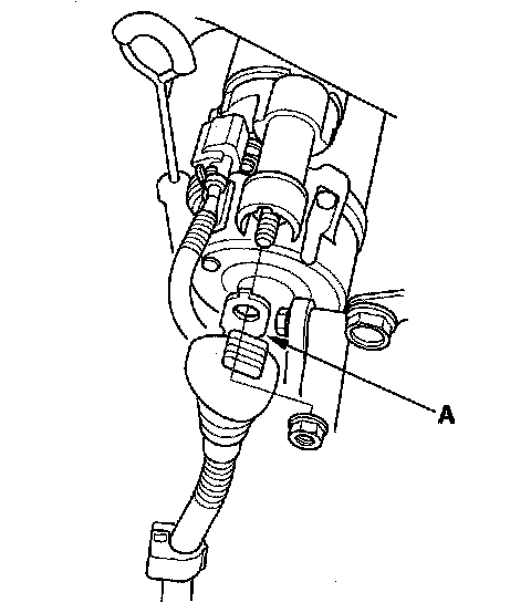 20. Make a reference mark (B) across the steering joint and steering gearbox pinion shaft. Remove the steering joint bolt (C), and loosen the steering joint bolt (D), then disconnect the steering joint from the steering gearbox pinion shaft (E).