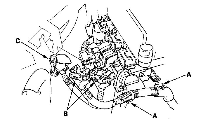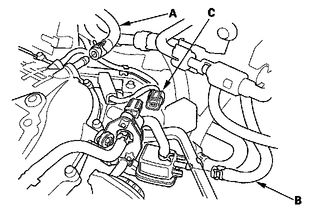 17. Disconnect the evaporative emission (EVAP) canister purge valve connector (C).