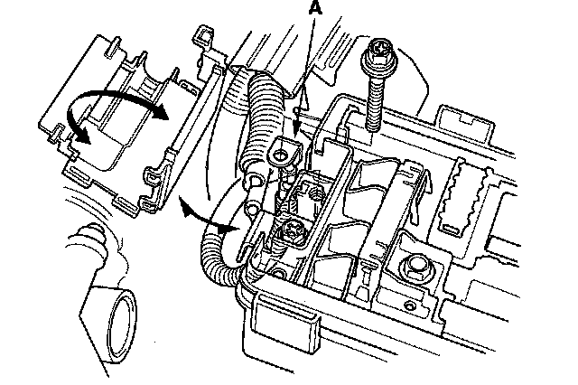 21. Remove the alternator cable (A) from the main under-hood fuse box.