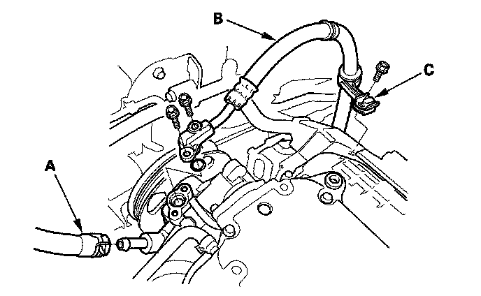 26. Remove the power steering (P/S) pump inlet hose (A) and P/S pump outlet hose (B) from the P/S pump, then plug the P/S lines and P/S pump.