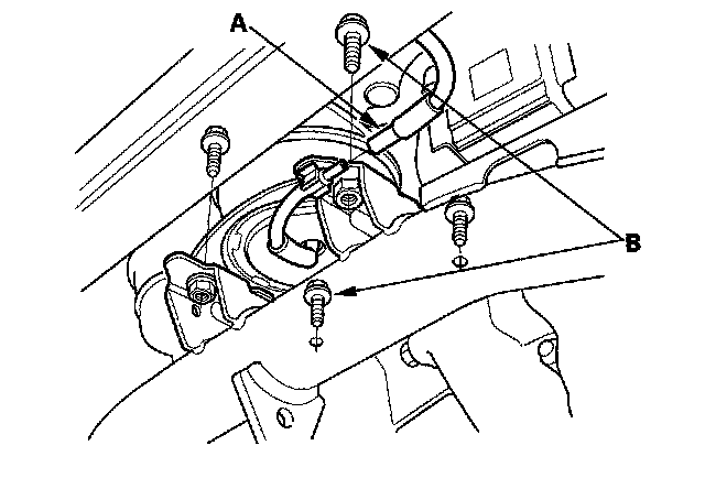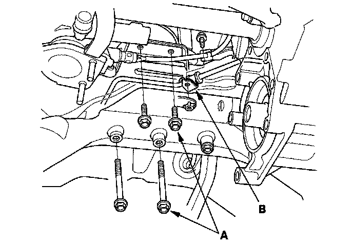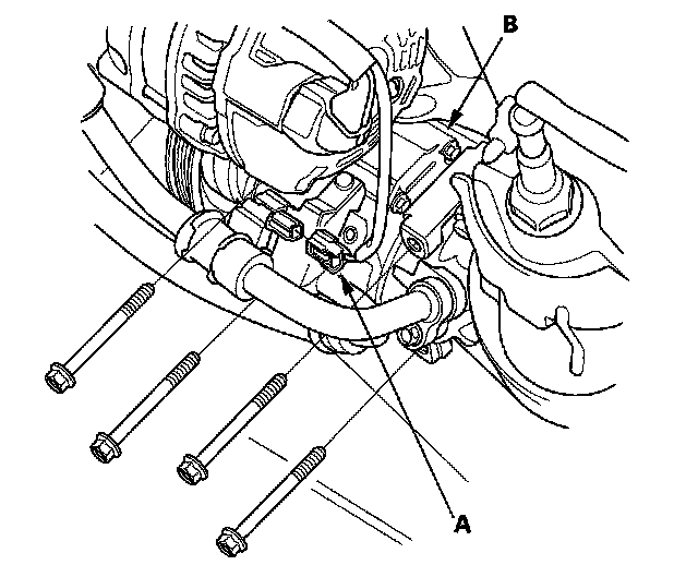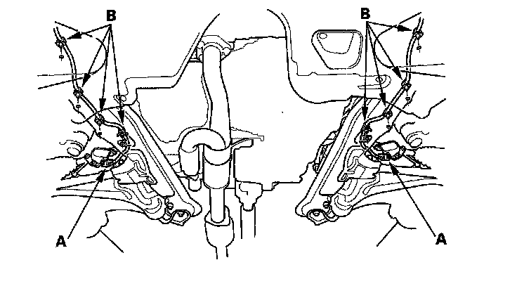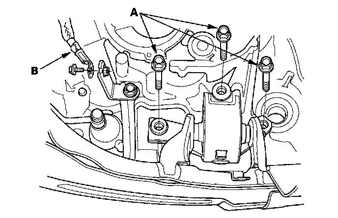 60. Disconnect the front engine mount control solenoid valve tube (A), then remove the front engine mount bolts (B).